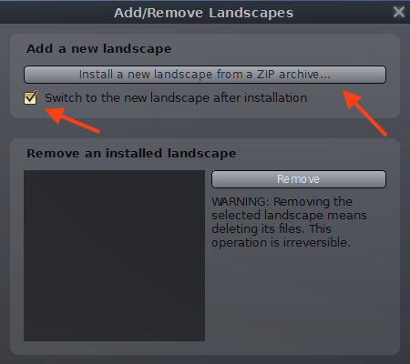 6. The "Add/Remove Landscapes" menu will appear. Under "Add a new landscape" check the box for "Switch to the new landscape after installation", as shown below. Then press the button marked "Install a new lansdcape from a ZIP archive..."